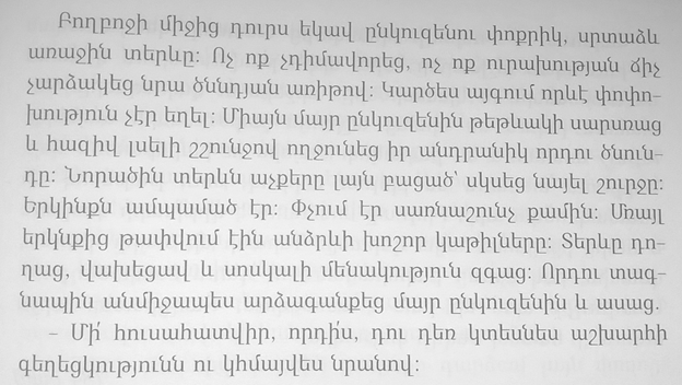 —Մի հուսահատվիր, որդի՜ս, դու դեռ կտեսնես աշխարհի գեղեցկությունն ու կհմայվես նրանով։