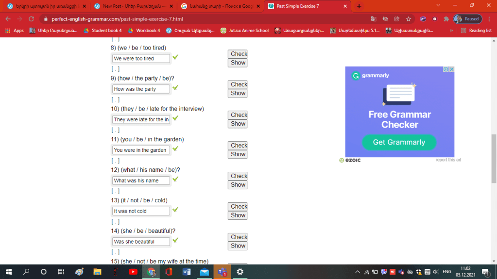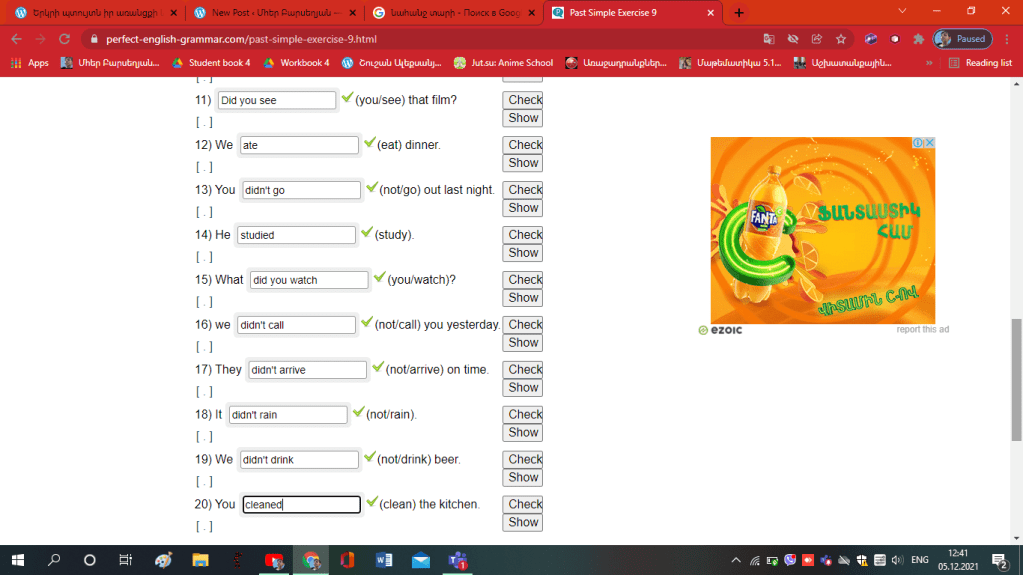 Рубрика: 2021-2022 ուստարի, Անգլերեն Past simple exercise 9 Опубликовано 5 декабря, 2021 автором Մհեր Բարսեղյան
