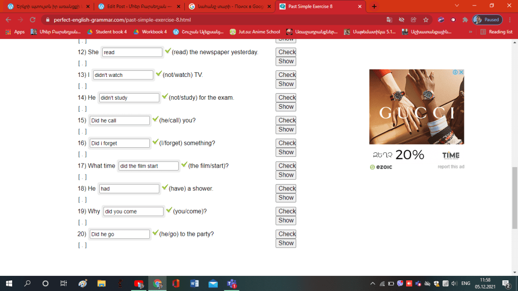 Рубрика: 2021-2022 ուստարի, Անգլերեն Past Simple exercise 8 Опубликовано 5 декабря, 2021 автором Մհեր Բարսեղյան
