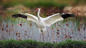 Журавль очень высок на ногах. У него большие крылья и длинные перья. Клюв журавля крепкий и острый.