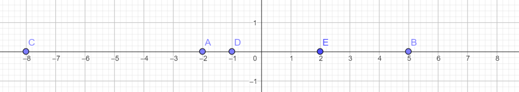 A (–2), B (+5), C (–8), D (–1), E (+2) կետերը։