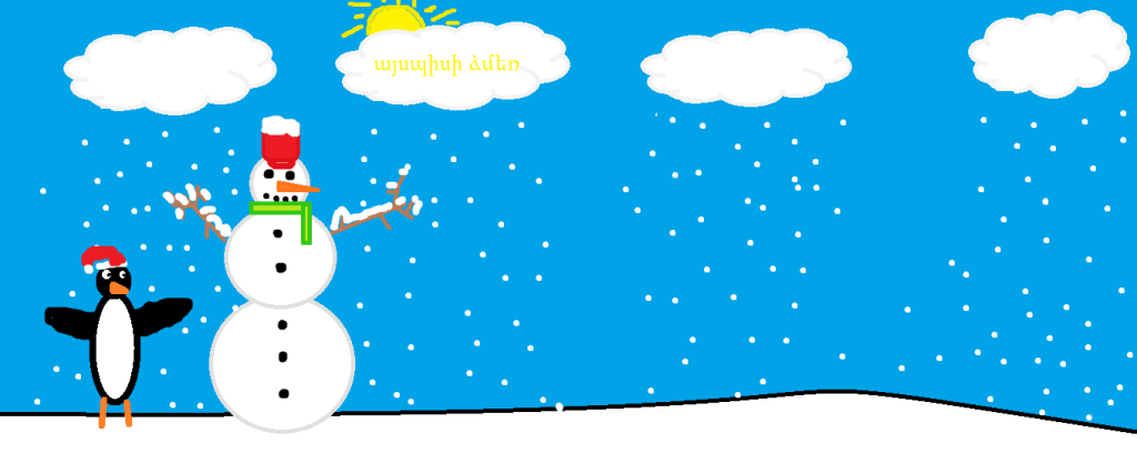 Ես նկարել եմ Անտարկտիդան:Այնտեղ շատ ցուրտ է և միշտ ձմեռ:Իմ նկարում պինգվինը ձնեմարդ է պատրաստել և ուրախ խաղում է: